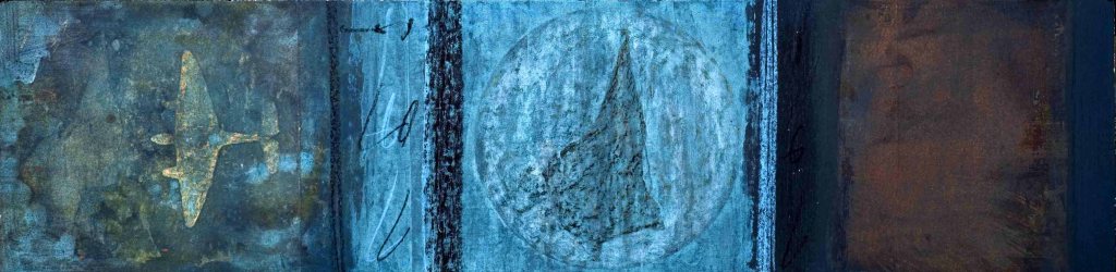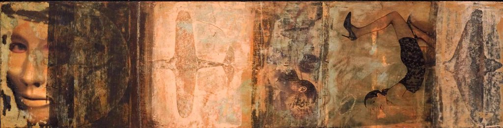 Каждый художник в стародавние времена, а эти вещи, так скажем, неновые, двадцатилетней давности приобщался к истории искусств, к искусству старых мастеров. Кто-то копии рисовал, кто-то стилистику заимствовал. Кто ещё чего. У меня это вылилось вот в такую форму. Взял репродукцию полюбившейся картинки, пусть, Ренуар или Ван-Гог, Энгр, пририсовал туда самолётик и немного поскоблил, потёр, состарил, в общем, приложит руку. Это коллажи.