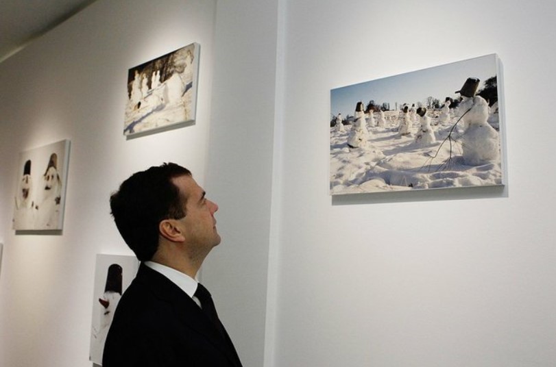 Д.А.Медведев на фоне работ К. Батынкова, Н.Полисского и С. Лобанова