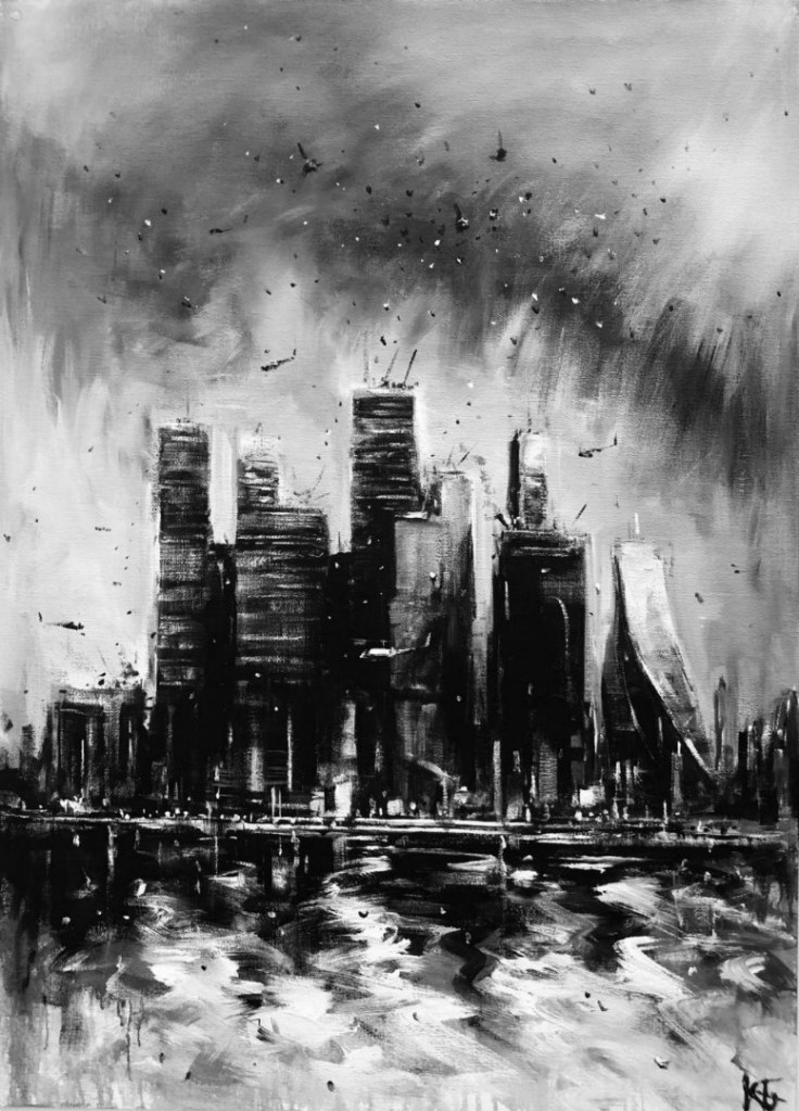 Я утром иду к автобусной остановке, меня окружает масса чёрно-белых человечков на фоне бесснежной серой зимы. Куда не посмотришь, везде строительные краны. Жижа с петардами под ногами. Кругом стаи собак, причём во всех административных округах, а перед глазами вечный силуэт Останкинской башни…